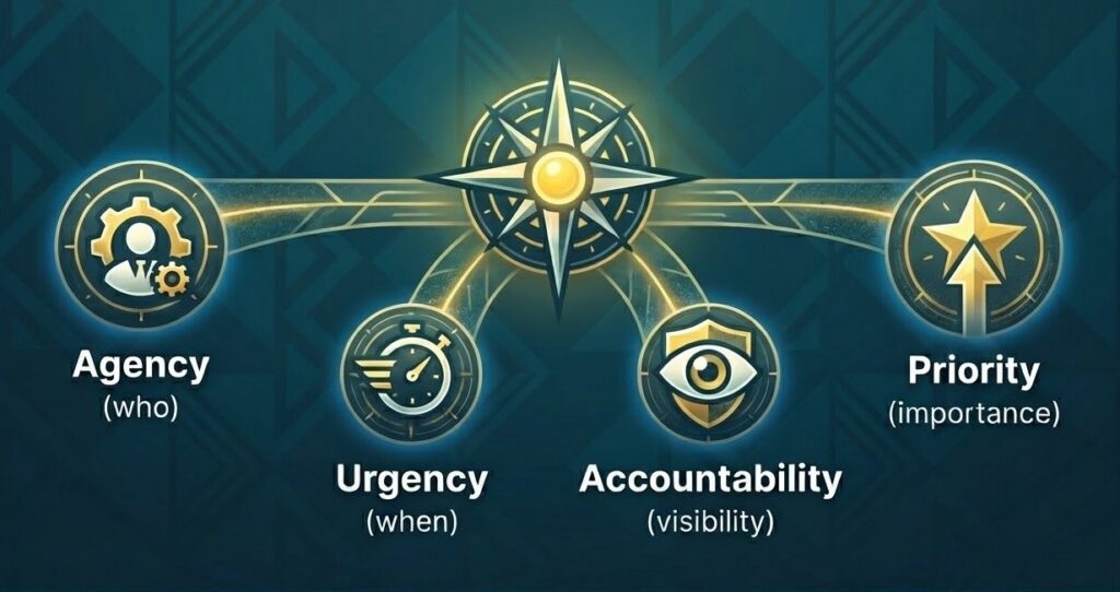Agency: This is the who that will be responsible for getting something done. We had a bad habit of assigning items to teams, not people. Having agency make people feel more personally responsible for getting stuff done.