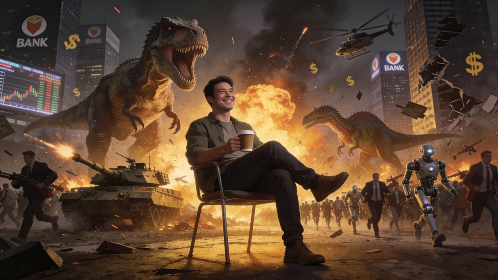 Calm man sitting happily while dinosaurs, explosions, and war rage behind him.